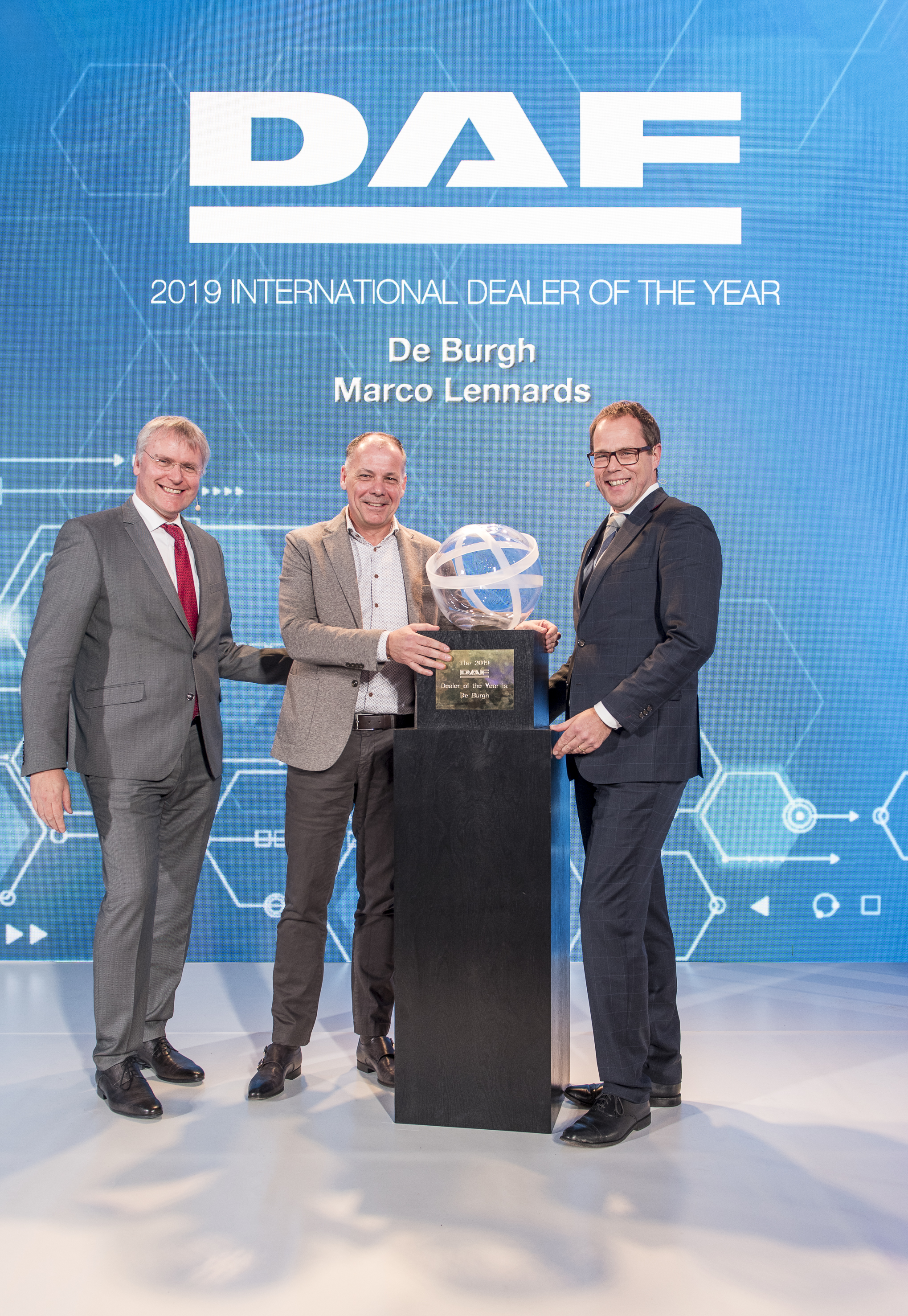 Lors de sa réunion internationale des concessionnaires à Malaga, en Espagne, DAF a décerné le prix du «Concessionnaire international DAF 2019» à De Burgh / LenGo (Pays-Bas) pour ses performances exceptionnelles en termes de ventes de camions, de pièces et de services financiers, ainsi que pour l’excellente satisfaction de ses clients. Le distributeur britannique F & G Commercials, du Royaume-Uni, a été nommé "Concessionnaire international de l’année PACCAR Parts Europe", alors que le distributeur polonais TB Truck & Trailer Serwis Sp. Z.o.o. a reçu le titre de «Concessionnaire international de l’année PACCAR Financial Europe».